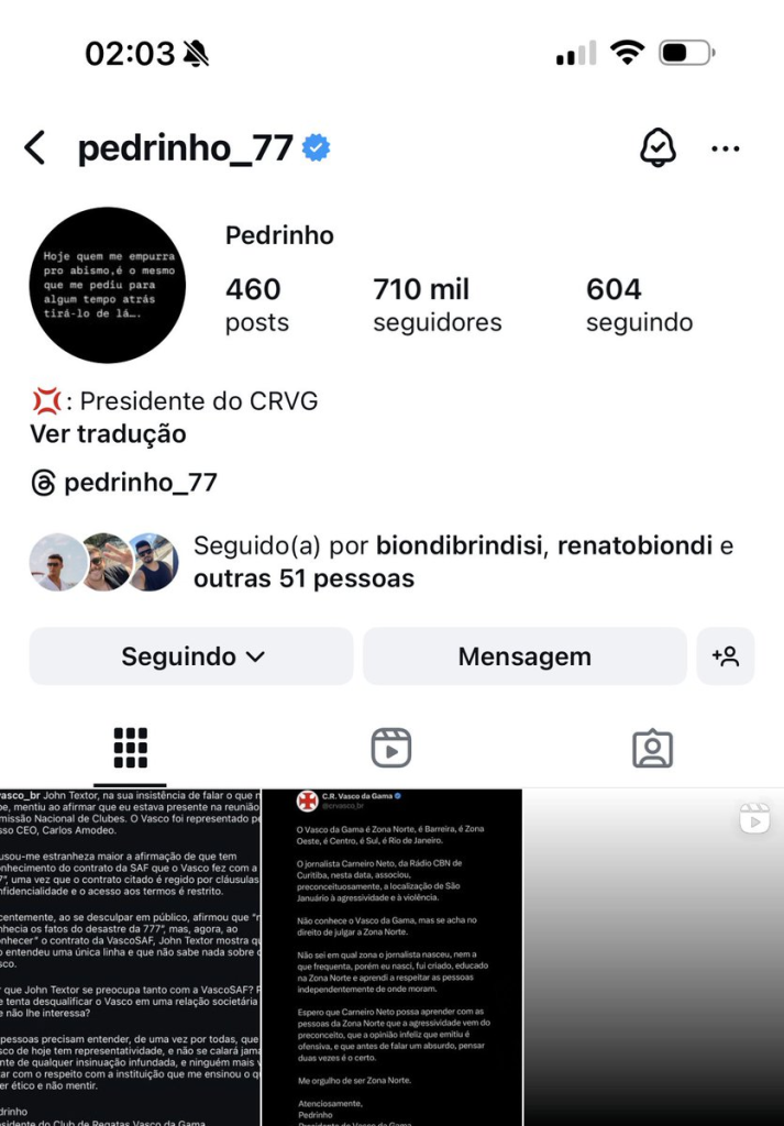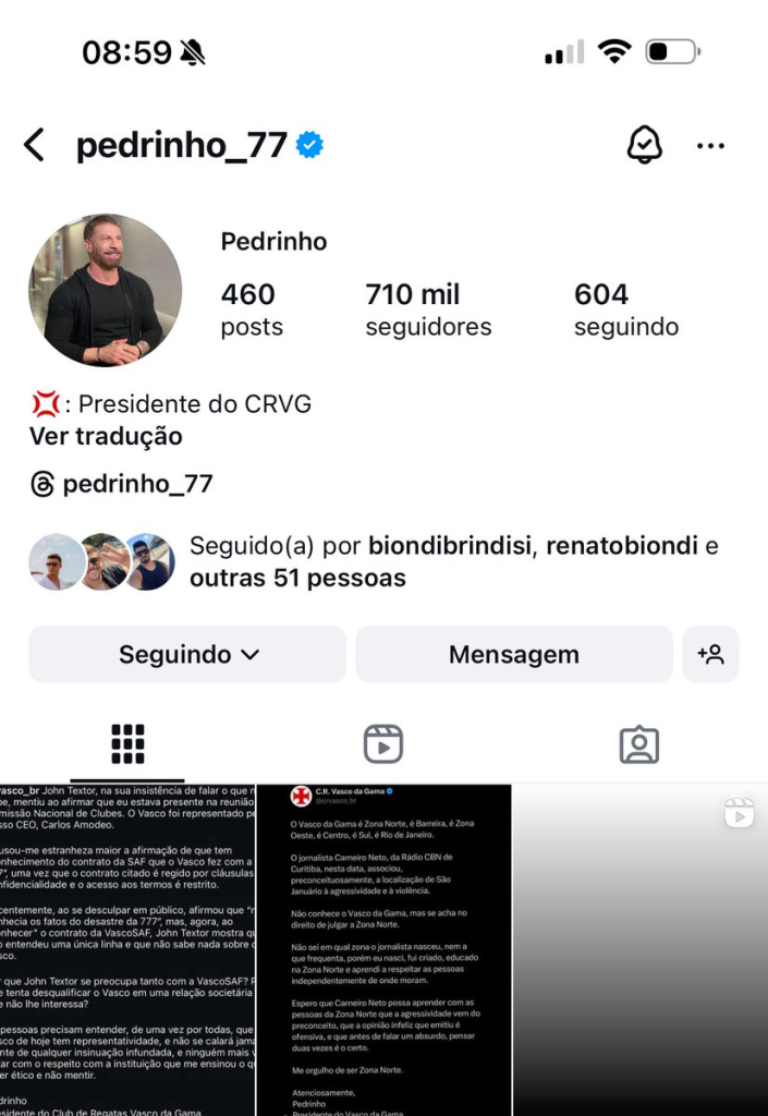 Uma atitude inusitada do presidente do Vasco da Gama, Pedrinho, chamou a atenção nas primeiras horas desta segunda-feira. Durante a madrugada, ele substituiu a foto de seu perfil no Instagram por uma imagem contendo um enigmático “recado”, o que gerou diversas interpretações e movimentou as redes sociais.