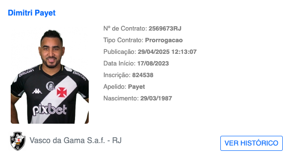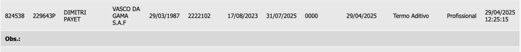 Dimitri Payet, camisa 10 do Vasco, teve seu contrato estendido até o dia 31 de julho, conforme publicado no BID da CBF e no Bira da Ferj. A prorrogação do vínculo acontece em meio a um momento de forte turbulência para o jogador, que está sendo investigado por uma acusação de agressão feita por Larissa Ferrari, sua suposta ex-amante. O caso está sob sigilo judicial.