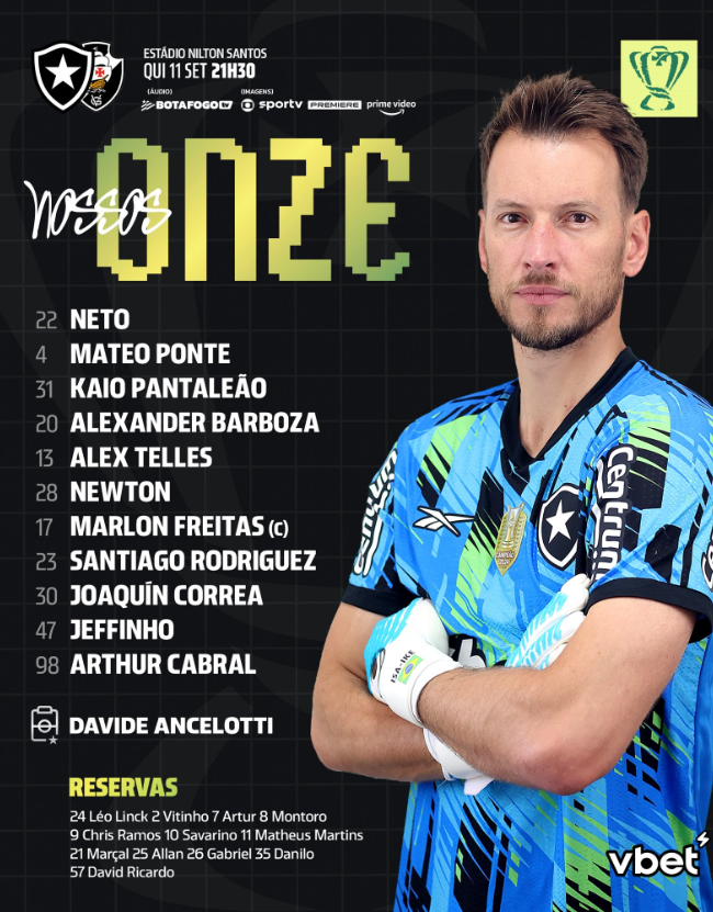 O Botafogo está escalado para enfrentar o Vasco, nesta quinta-feira (11), às 21h30, no Estádio Nilton Santos, pelo jogo de volta das quartas de final da Copa do Brasil. O técnico Davide Ancelotti surpreendeu na formação inicial, que tem mudanças significativas em relação às últimas partidas.