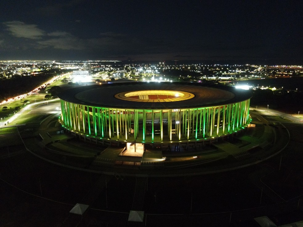 Estádio Mané Garrincha foi iluminado em verde e amarelo após o anúncio de Brasília como sede da Copa do Mundo Feminina — Foto: Lucas Magalhães/ge