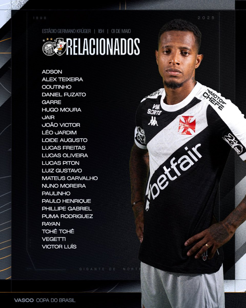 O Vasco da Gama divulgou, nesta terça-feira (29), a lista de jogadores relacionados para a partida contra o Operário-PR, que acontece nesta quinta-feira (1º), às 16h, no Estádio Germano Krüger, pela terceira fase da Copa do Brasil.