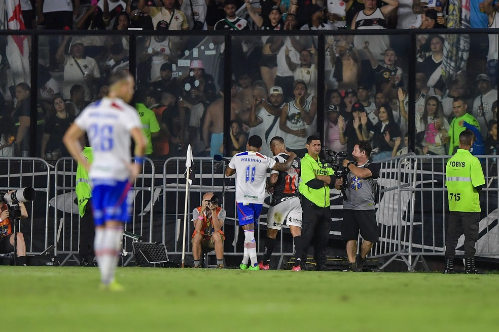 Coutinho e Marinho saem abraçados depois de expulsão em Vasco x Fortaleza: time de São Januário venceu por 3 a 0 — Foto: Thiago Ribeiro/AGIF