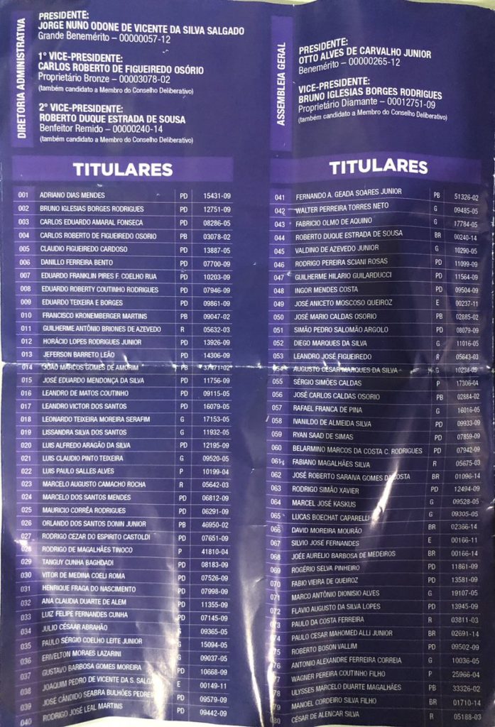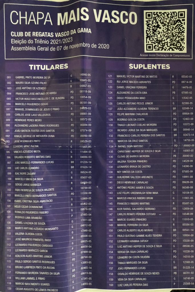 Após a definição judicial de que Jorge Salgado foi eleito presidente do Vasco da Gama, e Júlio Brant ficou em segundo, temos enfim a lista dos conselheiros do próximo triênio, sendo 120 deles da Mais Vasco, e 30 da Sempre Vasco.