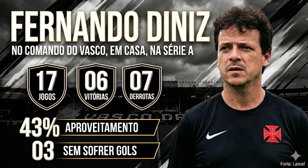A derrota para o Bahia na última quarta-feira expôs uma ferida que vai além de um resultado isolado: o Vasco da Gama deixou de ser temido em seus domínios. Um levantamento realizado pelo jornal Lance! traz números alarmantes sobre a passagem do técnico Fernando Diniz pelo clube em jogos válidos pela Série A do Brasileirão. O dado mais chocante é o saldo negativo: sob o comando do treinador, o Cruz-Maltino perdeu mais do que venceu atuando em São Januário.