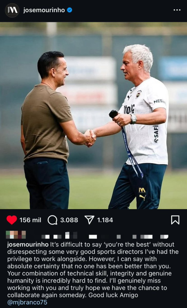 Contudo, Branco segue sendo a prioridade. Nas redes sociais, o diretor foi saudado pelo técnico José Mourinho em sua despedida do Fenerbahce: