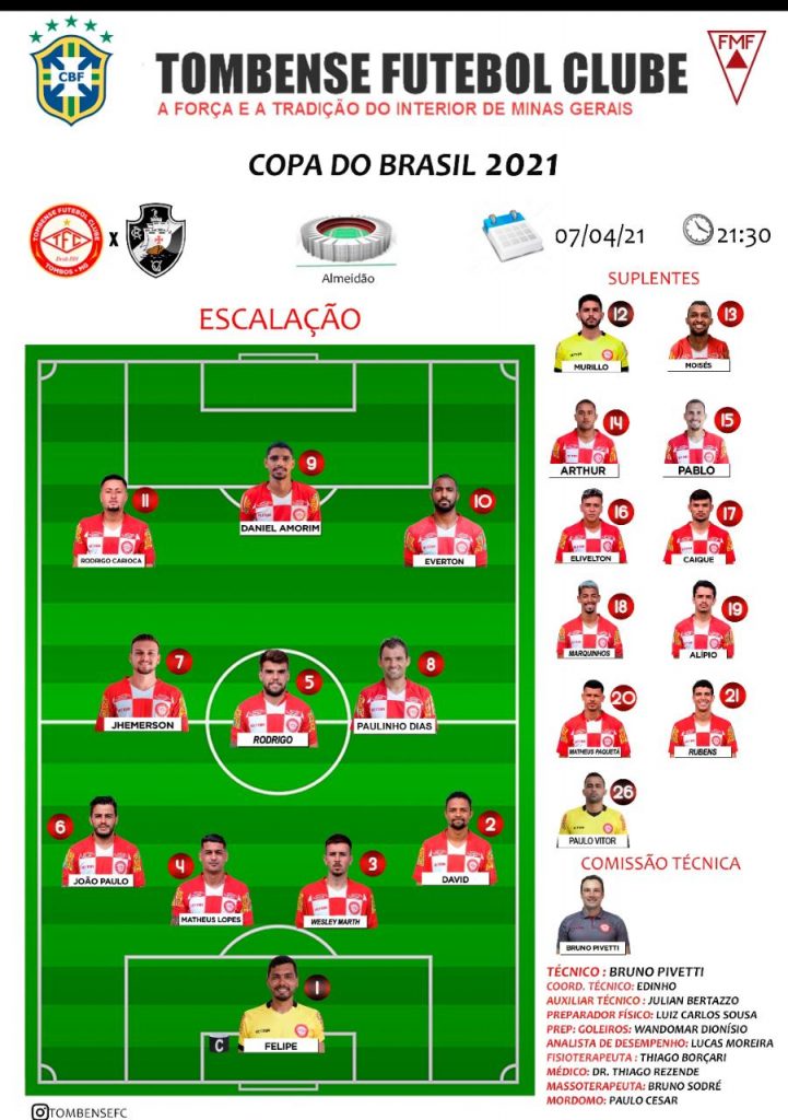 O Vasco enfrenta a Tombense nesta quarta (7), às 21h30, pela segunda fase da Copa do Brasil, no estádio Almeidão, em Tombos.