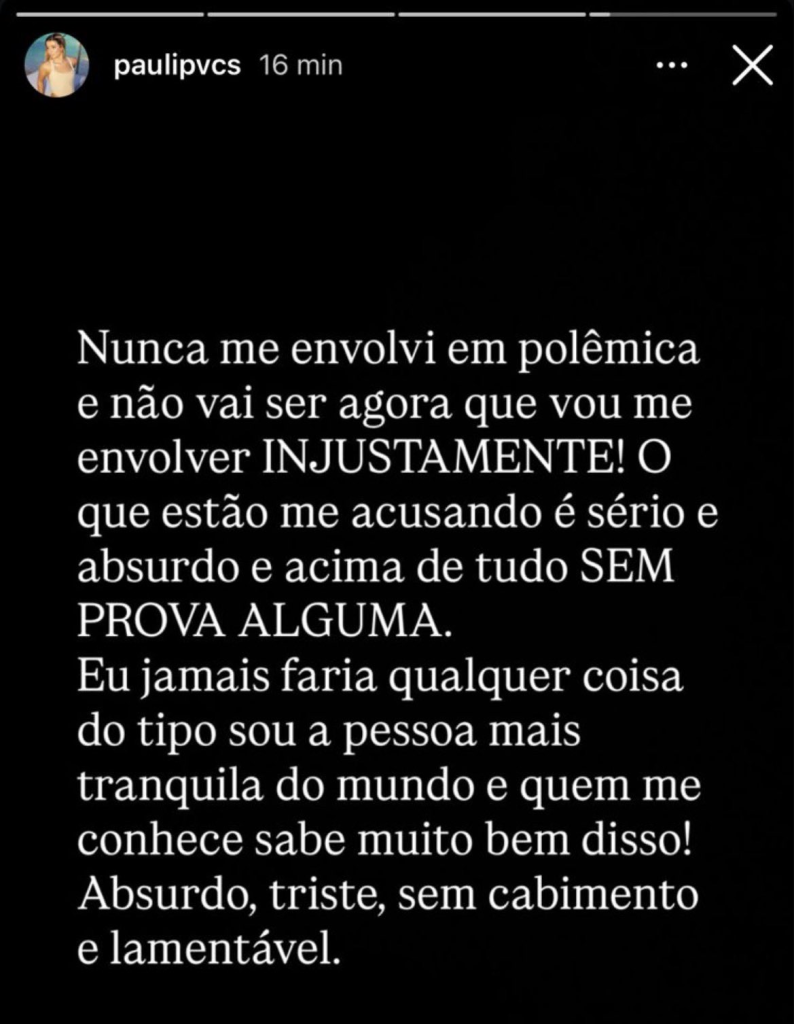 “Nunca me envolvi em polêmica e não vai ser agora que vou me envolver injustamente. O que estão me acusando é sério e absurdo e, acima de tudo, sem prova alguma. Eu jamais faria qualquer coisa do tipo, sou a pessoa mais tranquila do mundo e quem me conhece sabe disso.”