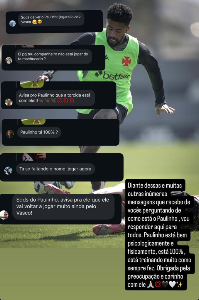 Em meio às constantes mensagens de torcedores vascaínos cobrando notícias sobre Paulinho, a esposa do volante decidiu se pronunciar nas redes sociais para atualizar a situação do jogador. Paulinho, que não tem sido utilizado por Fernando Diniz nas últimas partidas, gerou dúvidas entre os cruz-maltinos sobre sua condição física.