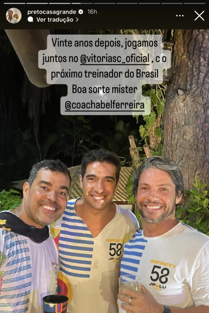 O ex-meia do Vasco Preto Casagrande, em suas redes sociais compartilhou um registro junto ao Abel, e indiciou que o português será o próximo treinador da seleção. “O próximo treinador do Brasil. Boa sorte, Mister Abel Ferreira”, disse o ex-jogador.