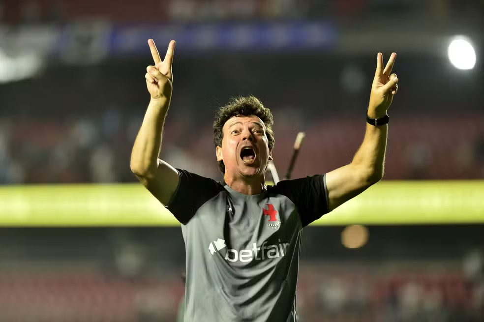 Fernando Diniz comemora vitória do Vasco sobre o Santos — Foto: Marcos Ribolli / ge