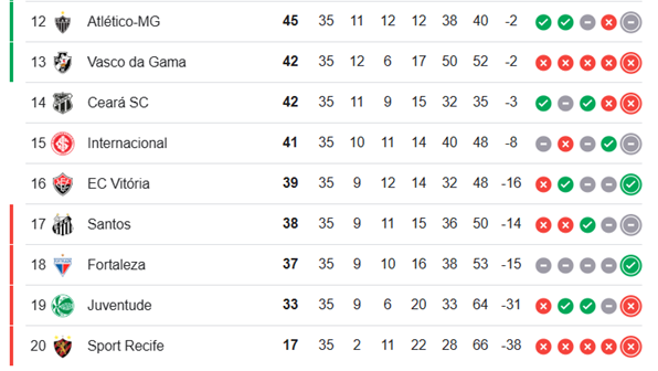 A vitória do Fortaleza fora de casa sobre o Bragantino aumentou a pressão sobre o Vasco na luta contra o rebaixamento. Com o resultado, o time cearense chegou aos 37 pontos e diminuiu para cinco a distância para o Cruz-Maltino, que segue com 42 pontos após cinco derrotas consecutivas.