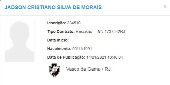 O zagueiro Jadson não é mais jogador do Vasco. A rescisão do vínculo com o clube carioca foi publicada na tarde desta quinta-feira (14) no BID (Boletim de Informativo Diário) da CBF.