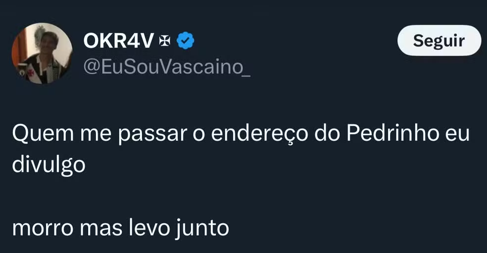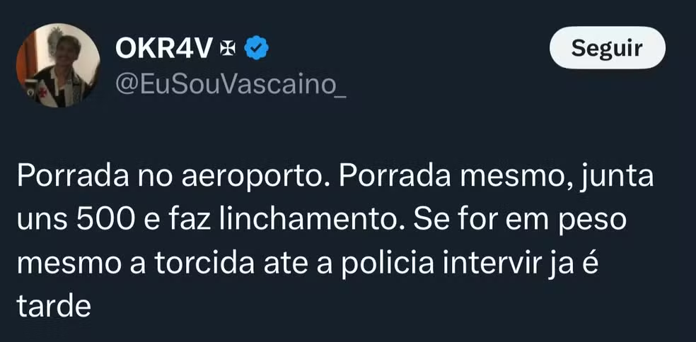 — Após o jogo, me deparei com o influenciador Krav, autor de postagens que incentivavam violência contra o presidente, linchamento aos jogadores e até ameaças de divulgar endereços. Na frente da PM, disse que aquilo era crime e que estava prejudicando o Vasco. Não houve qualquer tipo de agressão da minha parte. O vídeo mostra claramente que, quando a confusão aumenta, retiro o Krav da discussão para acalmar os ânimos. Agora, diante das mentiras que ele espalha, vou acionar a Justiça por calúnia e falso testemunho. Não vou permitir que distorçam os fatos nem que manchem minha reputação — declarou o dirigente.