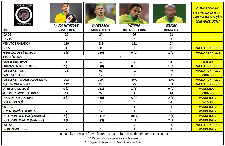 A análise do perfil comparou o desempenho de Paulo Henrique (Vasco), Vanderson (Monaco), Vitinho (Botafogo) e Wesley (Roma) em 16 quesitos diferentes, baseados em dados do Sofascore. Os critérios foram divididos pela quantidade de minutos que cada um esteve em campo, para criar uma média de efetividade.