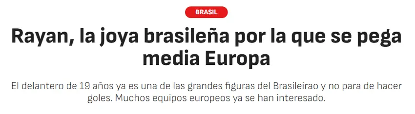 Segundo o As, “Rayan, a joia brasileira que atrai metade da Europa”, é hoje uma das estrelas do Campeonato Brasileiro. O jornal destacou o histórico do jogador, lembrando que ele já chamava atenção aos 11 anos, quando marcou 115 gols em uma única temporada pelas categorias de base do Vasco.