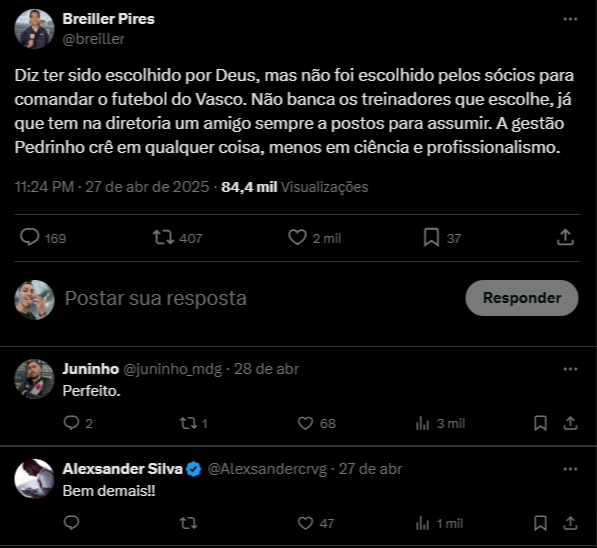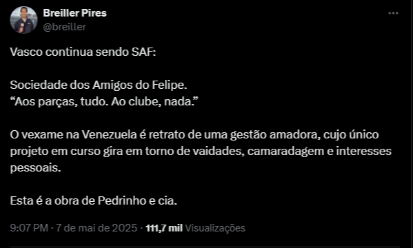 O jornalista afirmou ainda que a administração atual do Vasco está baseada em vaidades, camaradagem e interesses pessoais, e não em critérios técnicos ou esportivos. Para ele, o vexame na Venezuela foi o reflexo de uma gestão amadora, que não tem projeto esportivo claro e ignora a ciência e o profissionalismo no futebol.