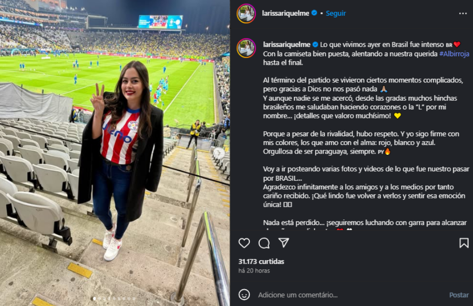 Larissa esteve no Brasil para acompanhar seu país contra a nossa Seleção pelas Eliminatórias da Copa 2026 – Foto: Reprodução Instagram
