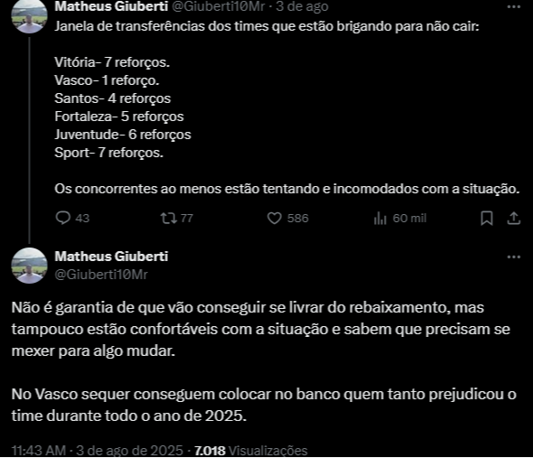 A paralisia do Vasco no mercado contrasta diretamente com a urgência de sua situação na tabela. A crítica feita pelo jornalista em sua publicação resume o sentimento geral.