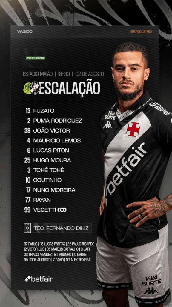 A escalação confirmada do Vasco é a seguinte: Daniel Fuzato; Puma Rodríguez, João Victor, Mauricio Lemos e Lucas Piton; Hugo Moura, Tchê Tchê e Coutinho; Nuno Moreira, Vegetti e Rayan.