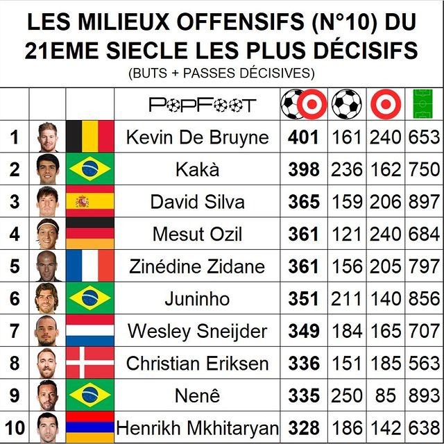 Na frente do Nenê, em 6°, também aparece o ídolo Juninho Pernambucano, que fez 211 gols e 140 passes para gols no século. Os brasileiros Kaká(2°), Oscar(17°) e Diego Ribas(19°) também aparecem no top 20.