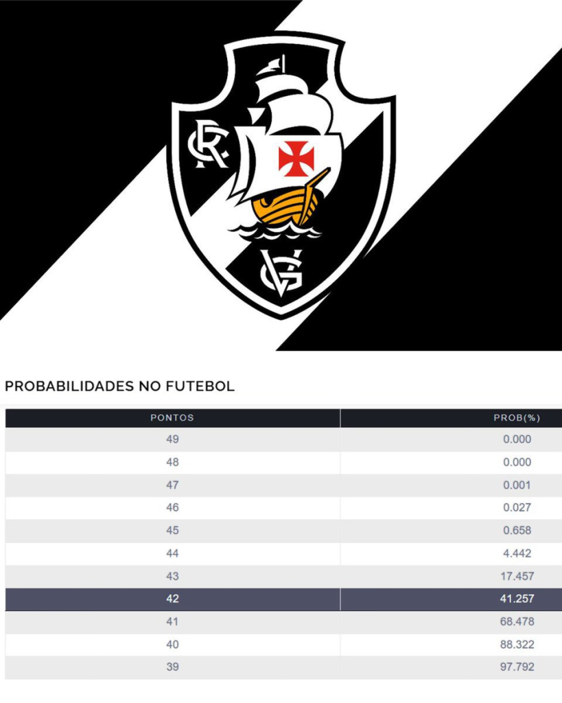 Restando quatro jogos, o time ainda depende apenas de si para permanecer na elite. O problema é o desempenho recente: a equipe “desaprendeu a jogar futebol”, como descreveu o próprio perfil que divulgou as probabilidades, refletindo a frustração da torcida após a forte queda de rendimento.