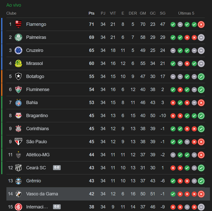 Com Ceará (43 pontos) e Grêmio (43) logo à frente, e Internacional (38), Santos (37), Vitória (36) e Fortaleza (34) abaixo, cada rodada pode alterar posições decisivas. No momento do levantamento, Ceará e Internacional se enfrentavam; uma vitória cearense empurraria o Vasco para a 14ª posição, aumentando a tensão nos bastidores.