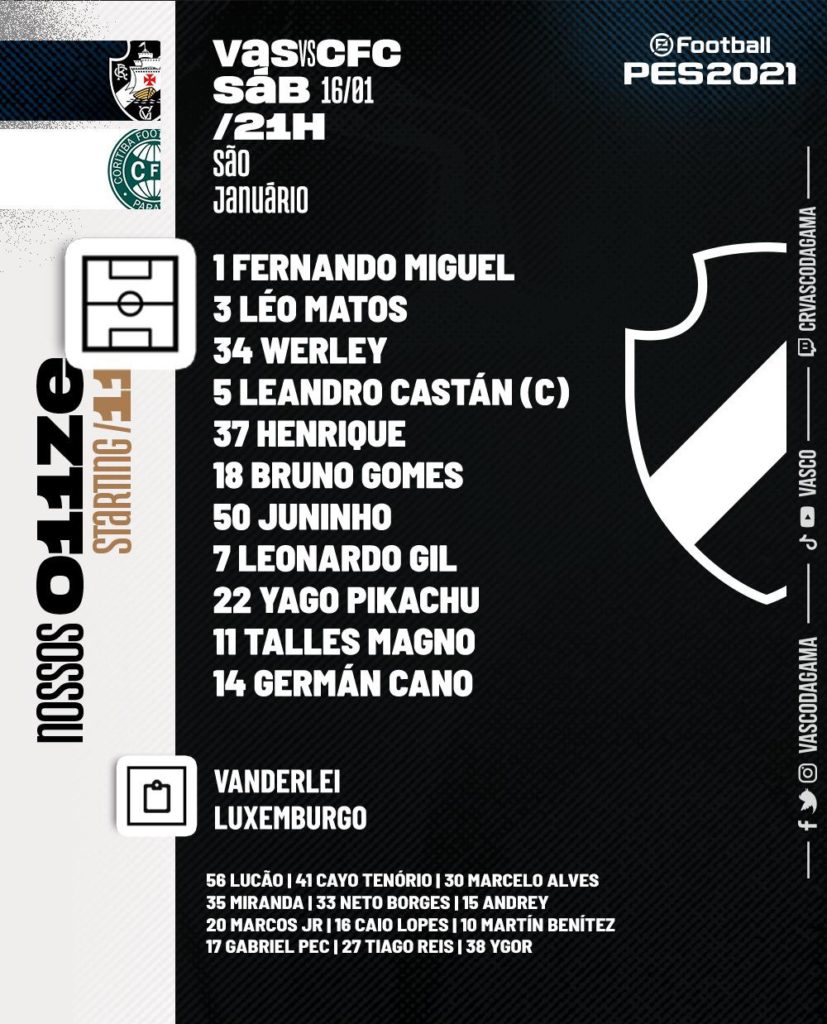 O Vasco divulgou oficialmente, através de sua conta oficial do Twitter, a escalação que vai enfrentar o Coritiba, neste sábado, pelo Campeonato Brasileiro