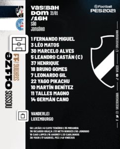 Veja abaixo a escalação oficial do Vasco para enfrentar o Bahia pelo Brasileirão: [caption id="attachment_7881" align="alignnone" width="242"]<img class="size-medium wp-image-7881" src="http://paponacolina.com.br/wp-content/uploads/2021/01/WhatsApp-Image-2021-01-31-at-14.56.37-242x300.jpeg" alt="" width="242" height="300" /> Foto: Divulgação / Vasco[/caption]