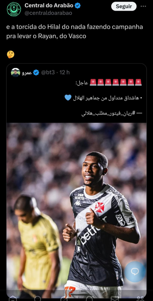 A mobilização dos torcedores sauditas aconteceu de forma espontânea. Eles subiram uma hashtag em árabe que, em tradução livre, significa “#RayanVitorÉUmaExigênciaDoAlHilal”. A campanha rapidamente ganhou força, mostrando que o nome do jovem de 19 anos é bem conhecido no Oriente Médio.