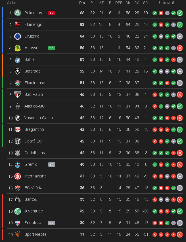 A combinação de resultados rebaixou o Gigante da Colina na tabela. O Vasco caiu da 9ª para a 10ª posição, estacionado nos 42 pontos. O time foi ultrapassado pelo Atlético-MG, que venceu o Sport por 4 a 2 e saltou para 43 pontos, assumindo o 9º lugar.