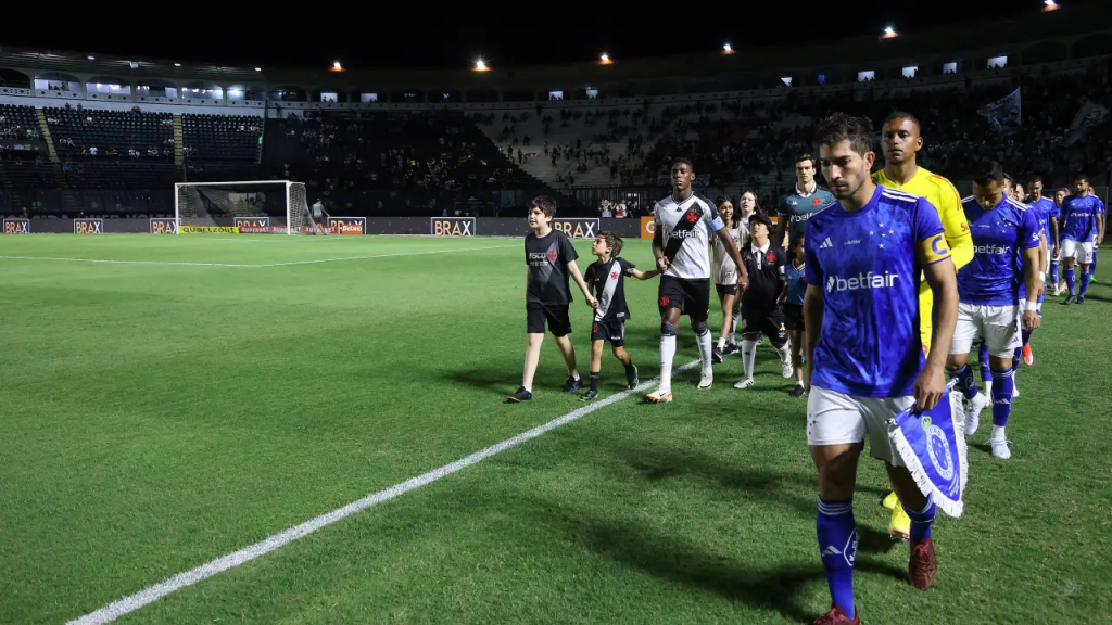 Equipes de Vasco e Cruzeiro entrando em campo pela última partida realizada entre as equipes, em 2024 (Wagner Meier/Getty Images)