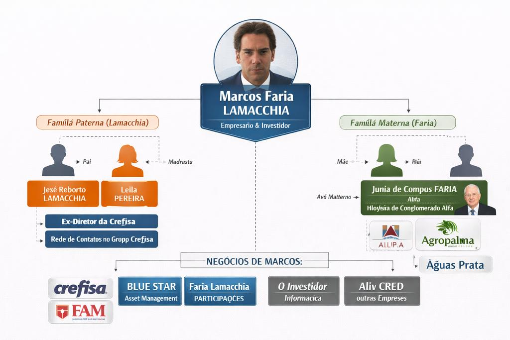 Marcos mantém sociedades diretas com a mãe em empresas como a Blue Star Asset Management, voltada à gestão de recursos e sem vínculo com a Crefisa, além da Faria Lamacchia Participações e da Hatha Empreendimentos. Em outros negócios, aparece de forma independente, como em O Investidor Informática, Aliv Cred e Marfalah Empreendimentos, entre outros.