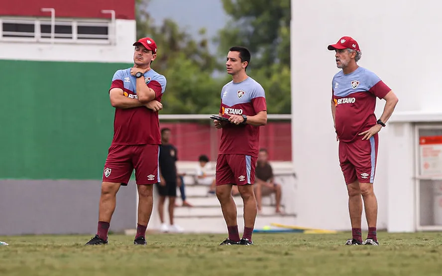 Fernando Diniz e sua comissão técnica no treino do Fluminense — Foto: Marcelo Gonçalves/Fluminense