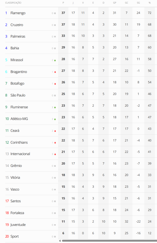 A situação na tabela é de altíssima tensão. O Vasco continua na 16ª posição, com 15 pontos. O problema é que o Santos, primeiro time dentro da zona de rebaixamento, tem a mesma pontuação. O time está a salvo apenas pelos critérios de desempate.
