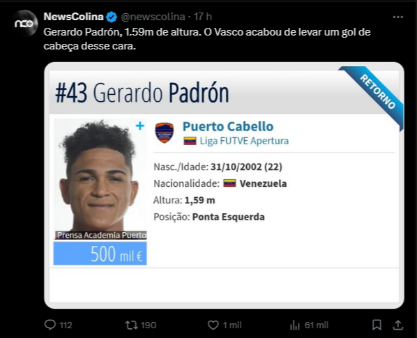 A repercussão foi imediata nas redes sociais. O perfil News Colina comentou: “Gerardo Padrón, 1.59m de altura. O Vasco acabou de levar um gol de cabeça desse cara.“