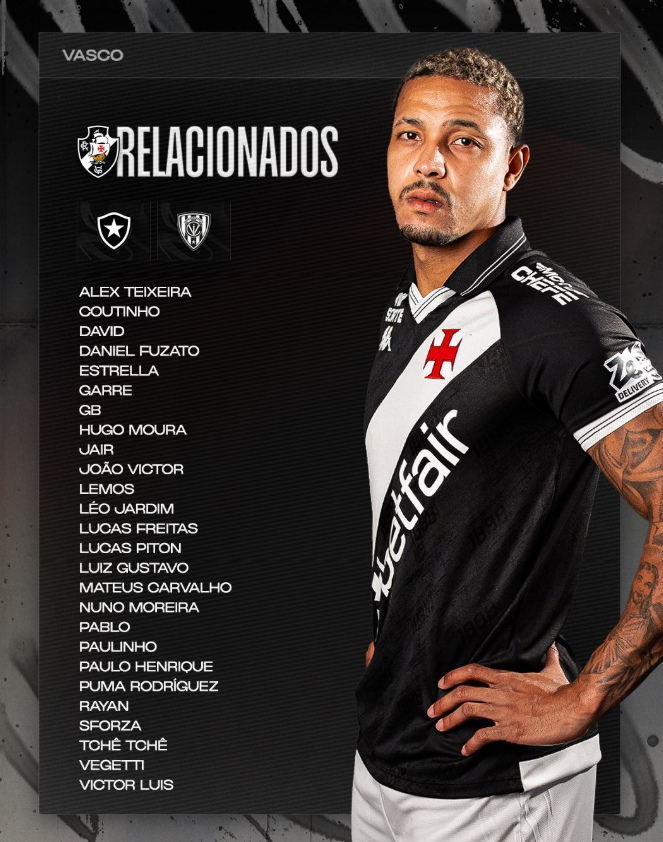 O Vasco divulgou a lista de relacionados para o clássico contra o Botafogo, neste sábado, no Estádio Mané Garrincha.