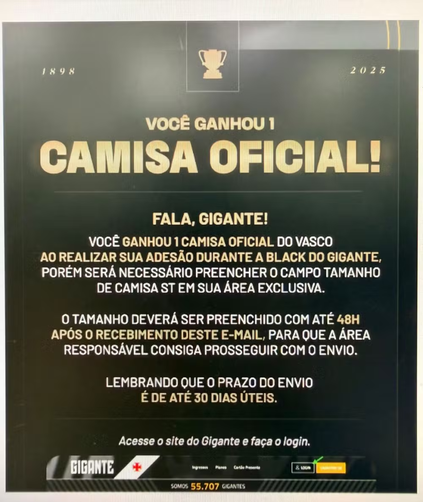 Enquanto as atenções do torcedor vascaíno estão voltadas para as correções táticas de Fernando Diniz em campo, uma crise silenciosa irrita parte da torcida fora dos gramados. O Vasco da Gama enfrenta reclamações de novos adeptos do programa Sócio Gigante, que relatam o não recebimento de camisas oficiais prometidas durante a campanha de Black Friday, realizada em novembro do ano passado. A informação foi divulgada primeiramente pela Blog do Ancelmo Gois, do jornal O Globo.
