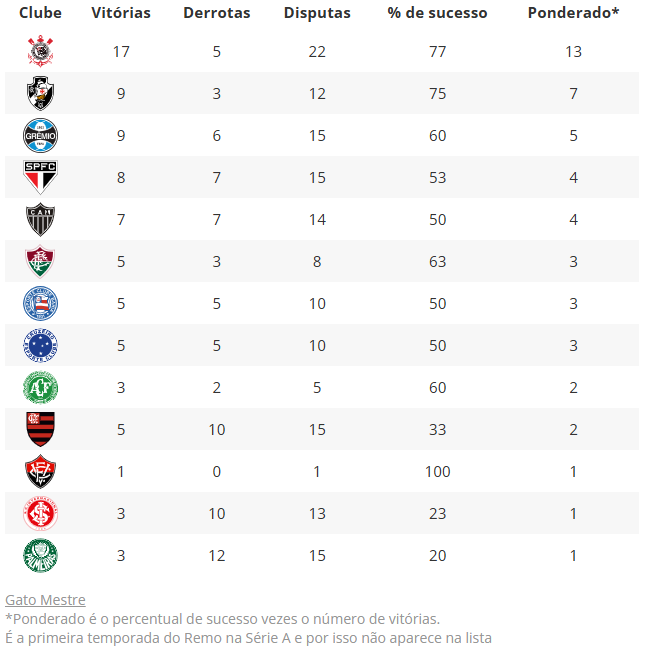 Para equilibrar a análise, o estudo utilizou um critério ponderado: o percentual de sucesso foi multiplicado pelo número de vitórias.