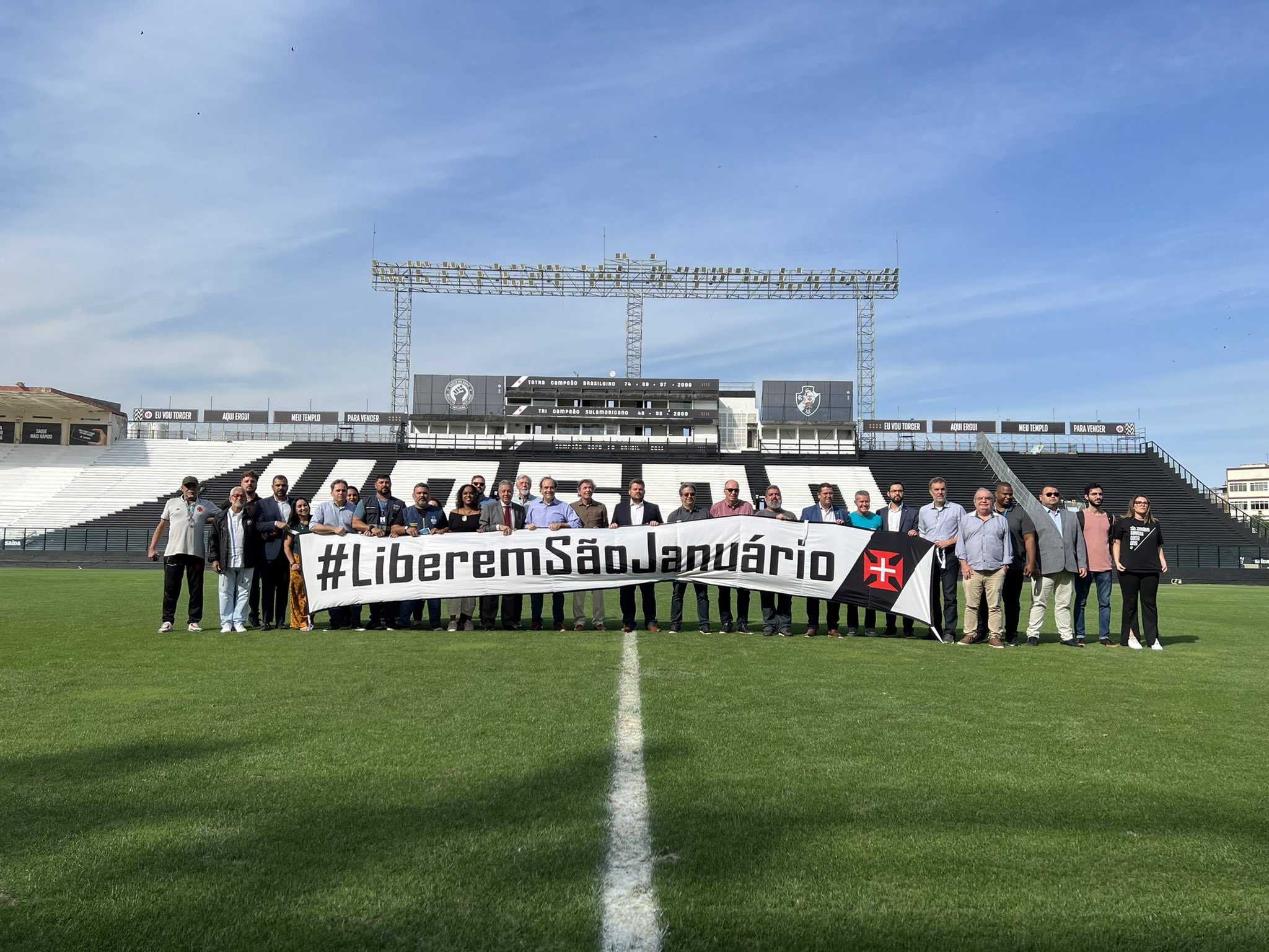 Em um movimento expressivo, a diretoria do Vasco lançou a campanha ” #LiberemSãoJanuário”, utilizando como pano de fundo o próprio gramado do estádio. Com uma faixa contundente em mãos, a equipe de gestão protestou visualmente contra a situação atual.