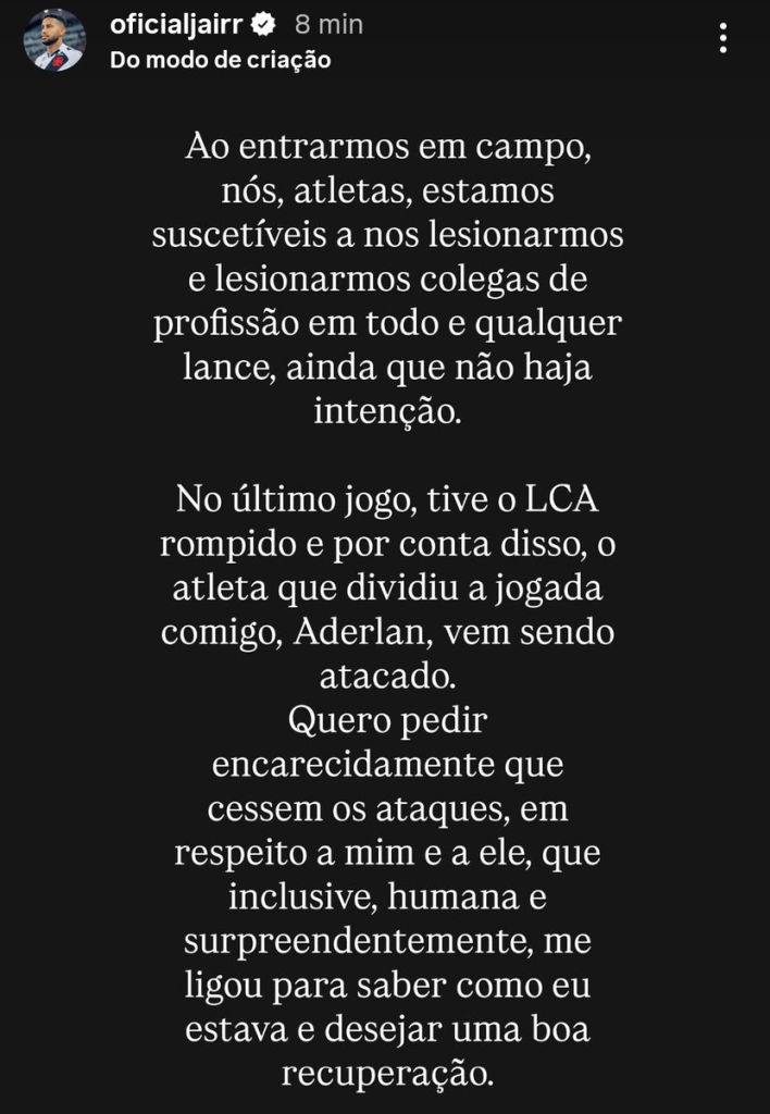 Em sua mensagem, Jair também falou sobre o futuro. Ele reconheceu o duro desafio que terá pela frente, mas prometeu empenho máximo para voltar aos gramados. O volante declarou: