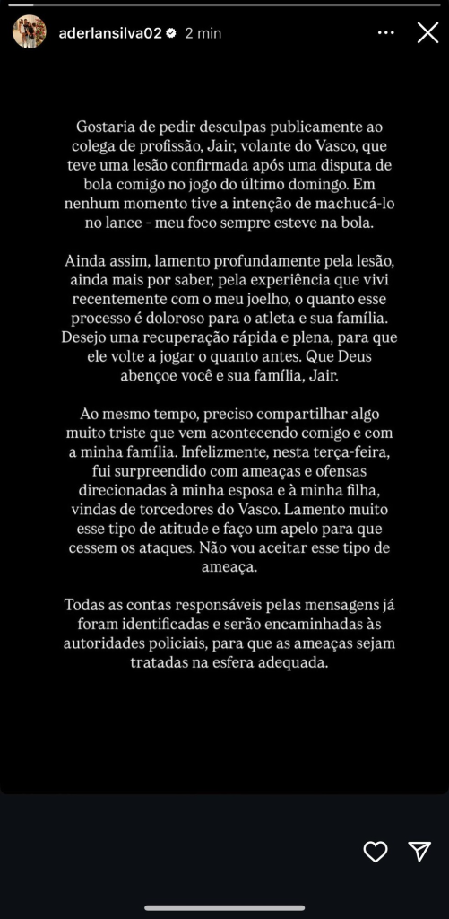 – Gostaria de pedir desculpas publicamente ao colega de profissão, Jair, volante do Vasco, que teve uma lesão confirmada após uma disputa de bola comigo no jogo do último domingo. Em nenhum momento tive a intenção de machucá-lo. Meu foco sempre esteve na bola.