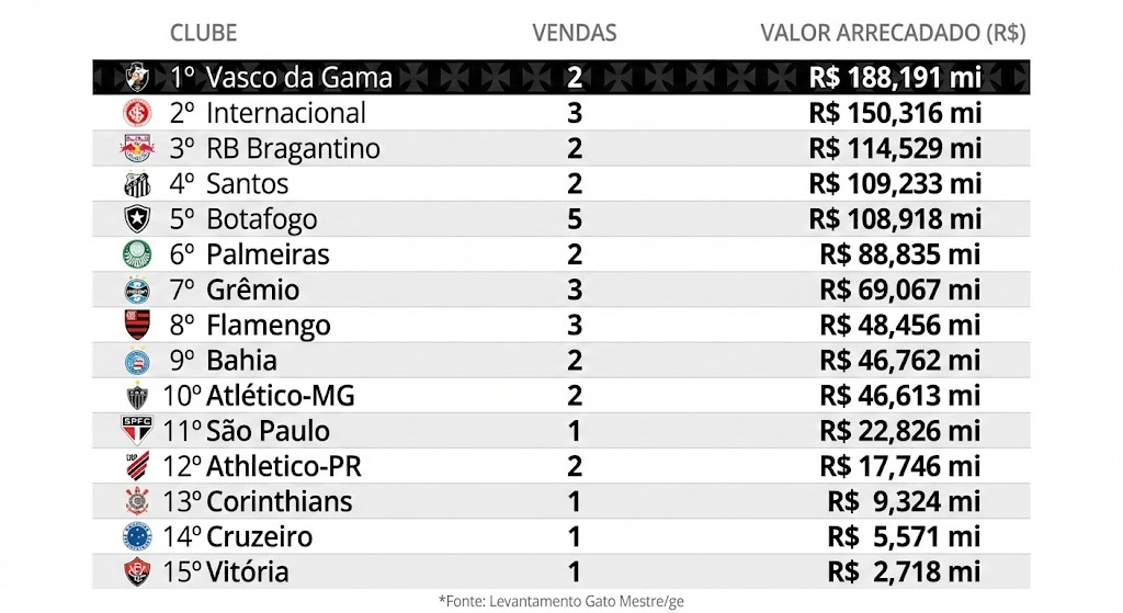 O Vasco da Gama é o protagonista financeiro da atual janela de transferências do futebol brasileiro, mas desta vez na ponta vendedora. Segundo levantamento realizado pelo Gato Mestre/ge, o clube de São Januário lidera a lista das equipes da Série A que mais faturaram com a venda de jogadores no início de 2026. Ao todo, cerca de R$ 188,191 milhões entraram nos cofres cruzmaltinos, valor que coloca o clube no topo de um mercado que já movimentou mais de R$ 1 bilhão em apenas um mês.