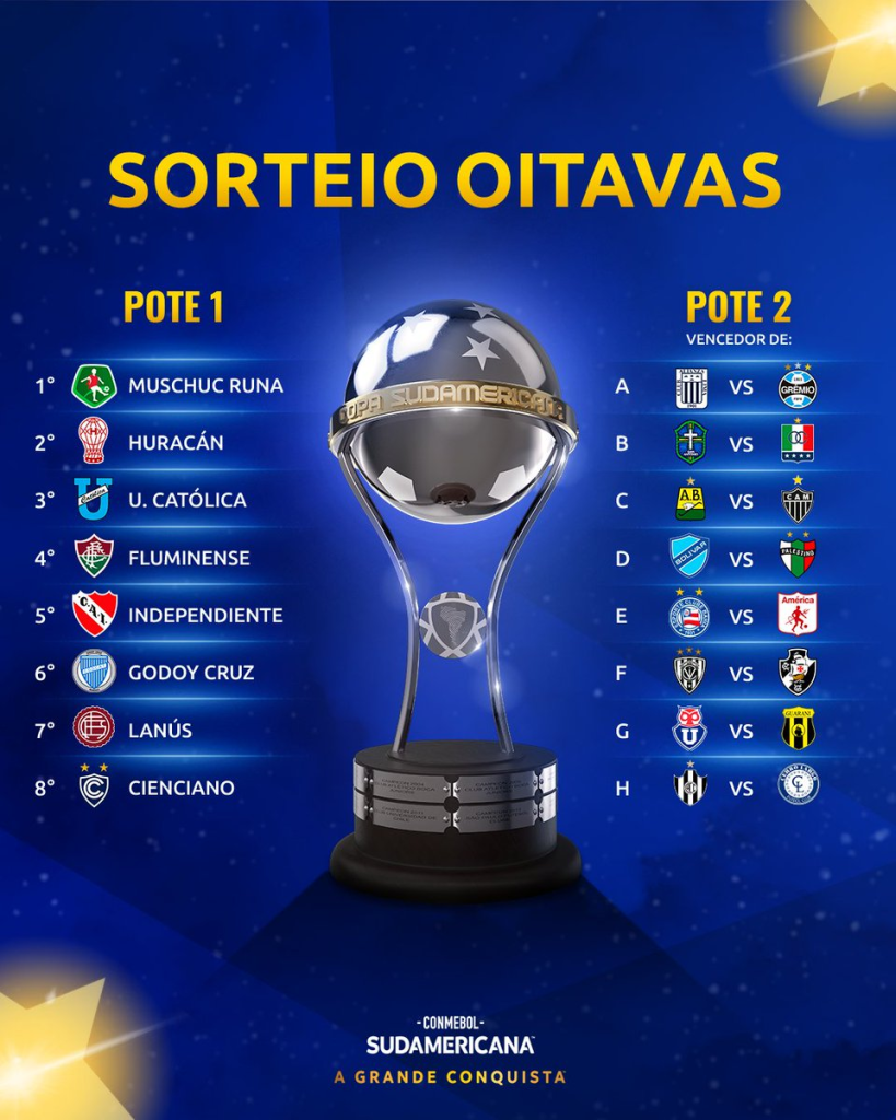 Mesmo precisando passar pelo playoff, o Gigante já conhecerá o possível adversário das oitavas de final. O sorteio da próxima fase da Copa Sul-Americana será realizado pela Conmebol na próxima segunda-feira, dia 2 de junho, às 12h (horário de Brasília). No mesmo dia, a CBF também sorteia os confrontos das oitavas de final da Copa do Brasil.