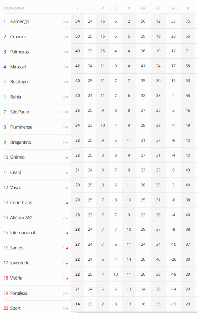 A 25ª rodada do Campeonato Brasileiro terminou com um saldo muito positivo para o Vasco, consolidando sua recuperação na competição. A vitória por 2 a 0 sobre o Cruzeiro no sábado chegou a colocar o time momentaneamente no top-10. Contudo, com os resultados dos jogos de domingo e segunda, o clube encerrou a rodada na 12ª posição, ainda assim, com uma vantagem muito confortável sobre a zona de rebaixamento.