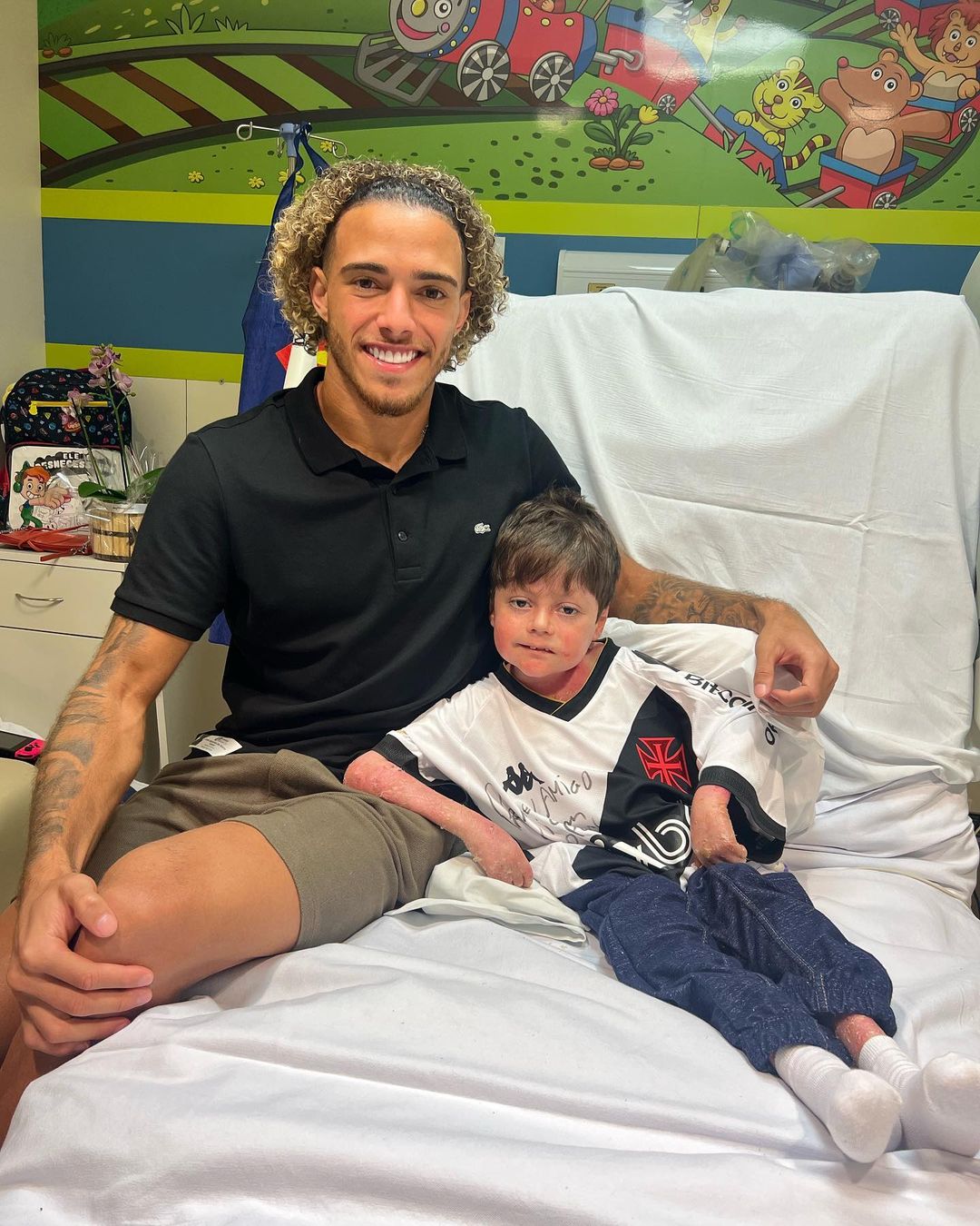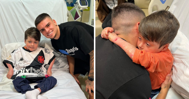 Durante o seu processo de recuperação, Guilherme Gandra Moura, carinhosamente chamado de Gui, de apenas oito anos, encontrou no futebol uma fonte de esperança e alegria. O pequeno recebeu uma visita surpreendente e emocionante dos jogadores da base, Gabriel Pec e Figueiredo. A presença dos crias do Vasco trouxe ainda mais ânimo para o menino, que luta corajosamente contra a epidermolise bolhosa, uma rara doença genética.