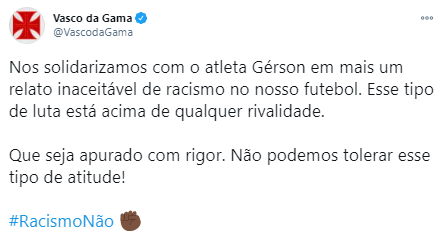 Após o episódio de racismo que aconteceu no confronto entre Flamengo x Bahia, envolvendo o meia Gerson, o Vasco da Gama, através de seu perfil no Twitter, se solidarizou pelo atleta.