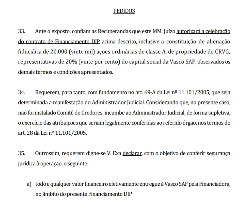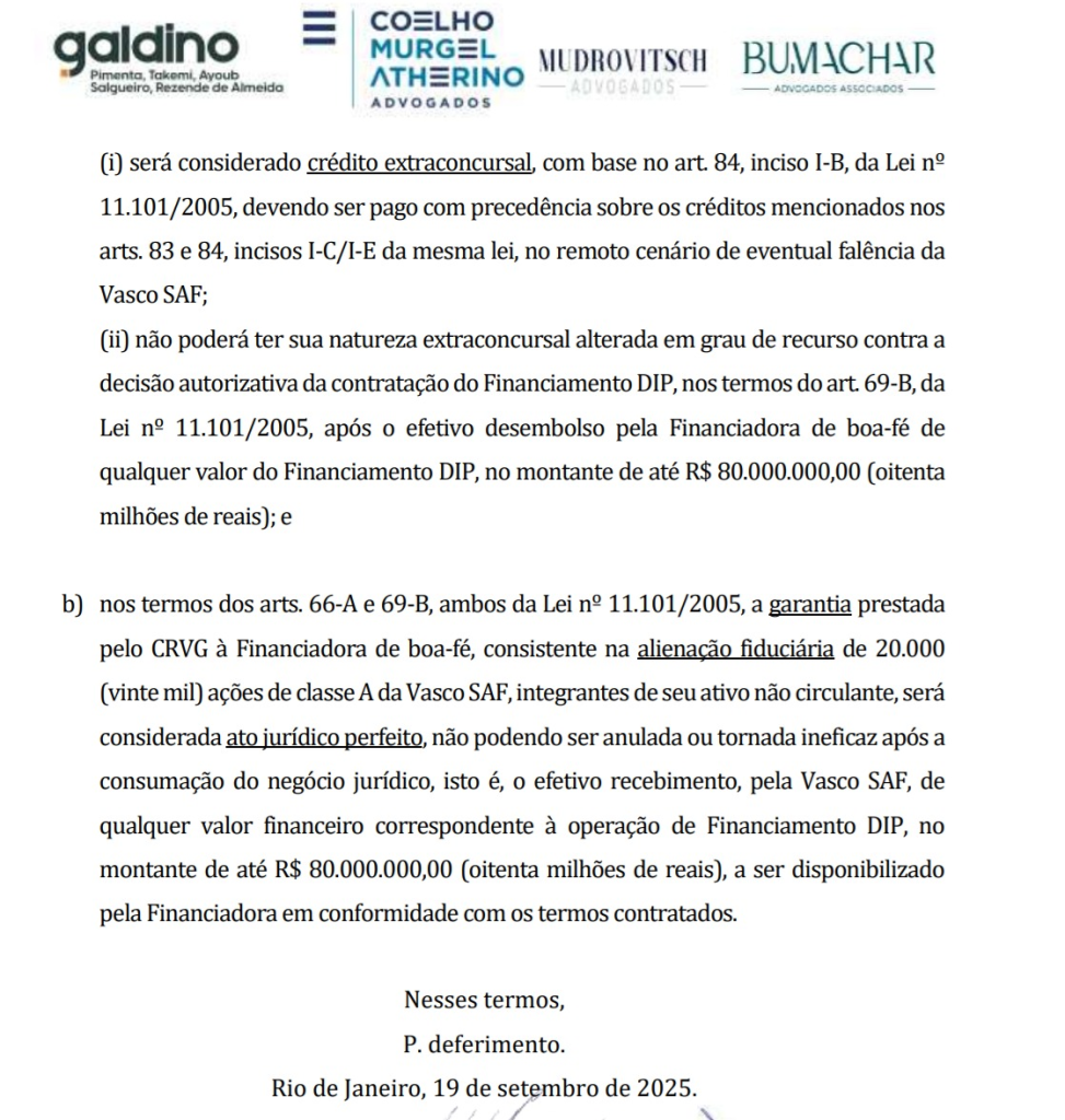 O Vasco da Gama deu mais um passo importante em meio ao processo de recuperação judicial. Na última sexta-feira, 19 de setembro, o clube solicitou à Justiça autorização para a contratação de um empréstimo no valor de até R$ 80 milhões, por meio de um Financiamento DIP (Debtor-in-Possession), mecanismo bastante utilizado em cenários de reestruturação financeira.