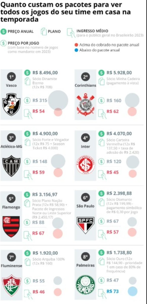 O resultado foi bem claro e impacta no torcedor. O jornalista Thales Machado realizou um levantamento e separou os planos de sócio-torcedor mais caros do Brasil, considerando o preço anual, preço por jogo e valor do ingresso médio. O Gigante da Colina ficou em primeiro na pesquisa. CONFIRA O GRÁFICO: