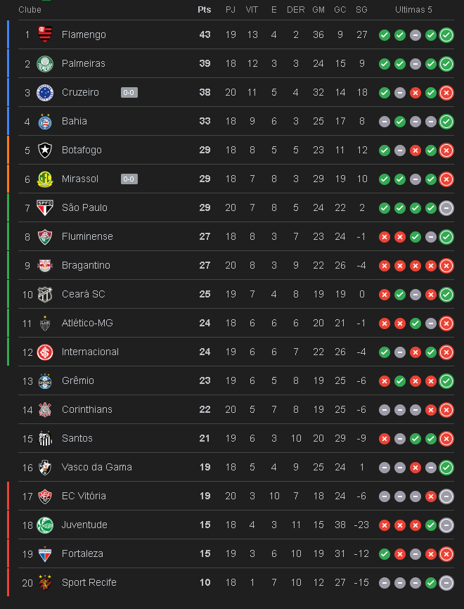 Com o fim de todos os jogos da rodada nesta segunda-feira, o Vasco confirmou sua posição. O time ocupa o 16º lugar, com 19 pontos, sendo o primeiro time fora da zona de rebaixamento. O resultado empurrou o Vitória, que também tem 19 pontos, para a 17ª posição, por conta do melhor saldo de gols do time carioca.