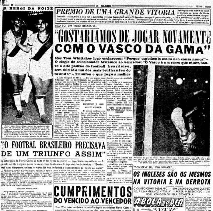 A partida que recebeu até a presença do vice-presidente, Nereu Ramos, foi tida na época com a partida do século, já que era o encontro da maior potência da terra da rainha contra o melhor time sul-americano, o Vasco, de Barbosa, Ely, Danilo Alvim, Ademir, Ipojucan e Heleno, que havia acabado de chegar do Boca Juniors-ARG.
